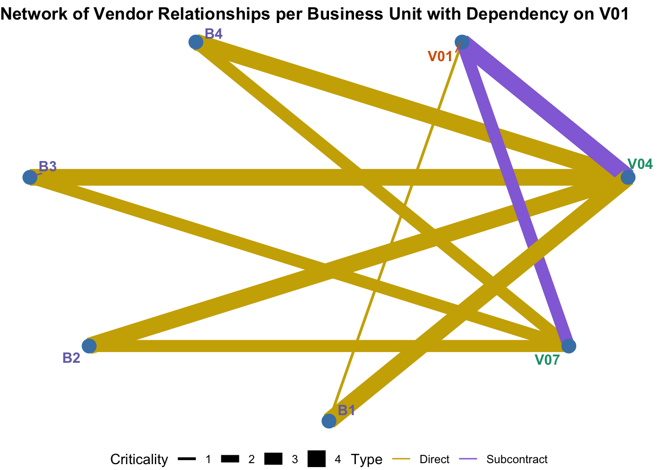 We want to understand where there are subcontractor dependencies in the supply chain. We focus on Vendor 1. First we filter for all direct relationships with Vendor 1, all subcontractor relationships with Vendor 1, and all relationships with those vendors that subcontract to Vendor 1. I’ve changed the graphic up a bit. Now instead of using the line intensity to indicate Criticality, I have used the line thickness. I have color coded the lines to indicate whether the relationship is Direct or Subcontract. Here we can see, as we noted in the earlier graph, there is only one non-critical Direct business unit relationship with Vendor 1. However, now you should also be able to identify that Vendor 4 and Vendor 7 subcontract to Vendor 1 in relation to critical services that impact all or most all of the business units. It is thus apparent that the dependency on Vendor 1 is much greater than understaood if just looking at the direct relationships and suggest that more due diligence on Vendor 1 may be warranted. This same type of analysis can be used to indentify dependencies on vendors where there is no direct relationship at all, or dependencies deeper in the supply chain itself.
